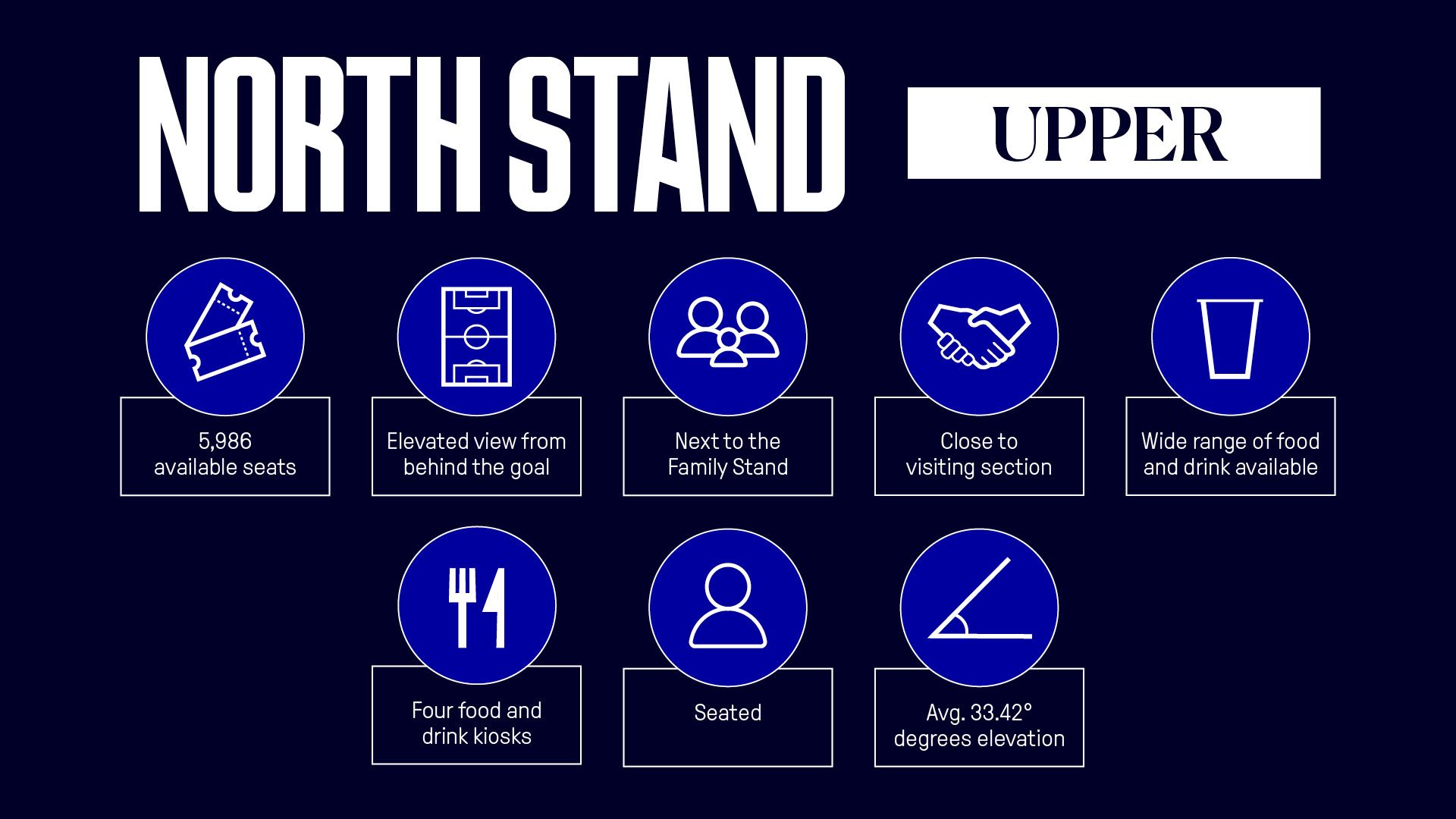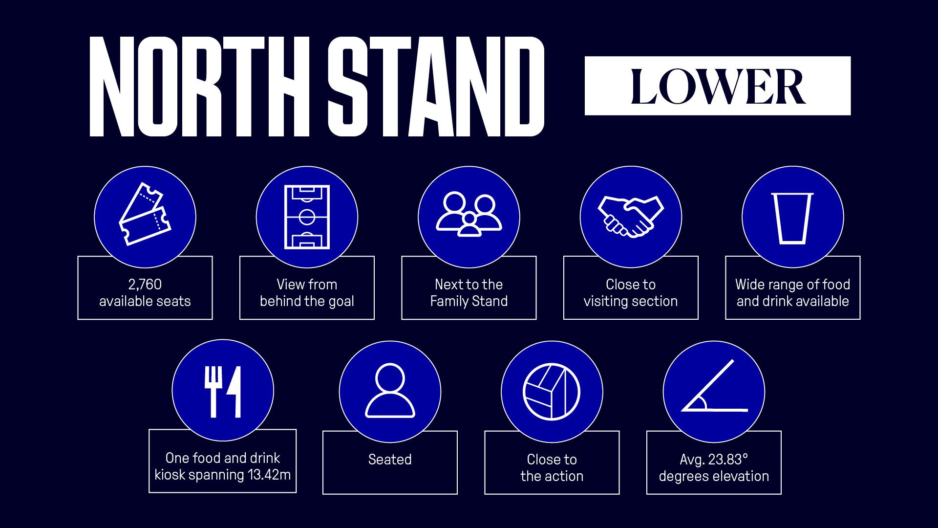 The North Stand offers supporters views from behind the goal and also houses the Family Stand in the north-west corner and visiting supporters’ section in the north-east corner.
