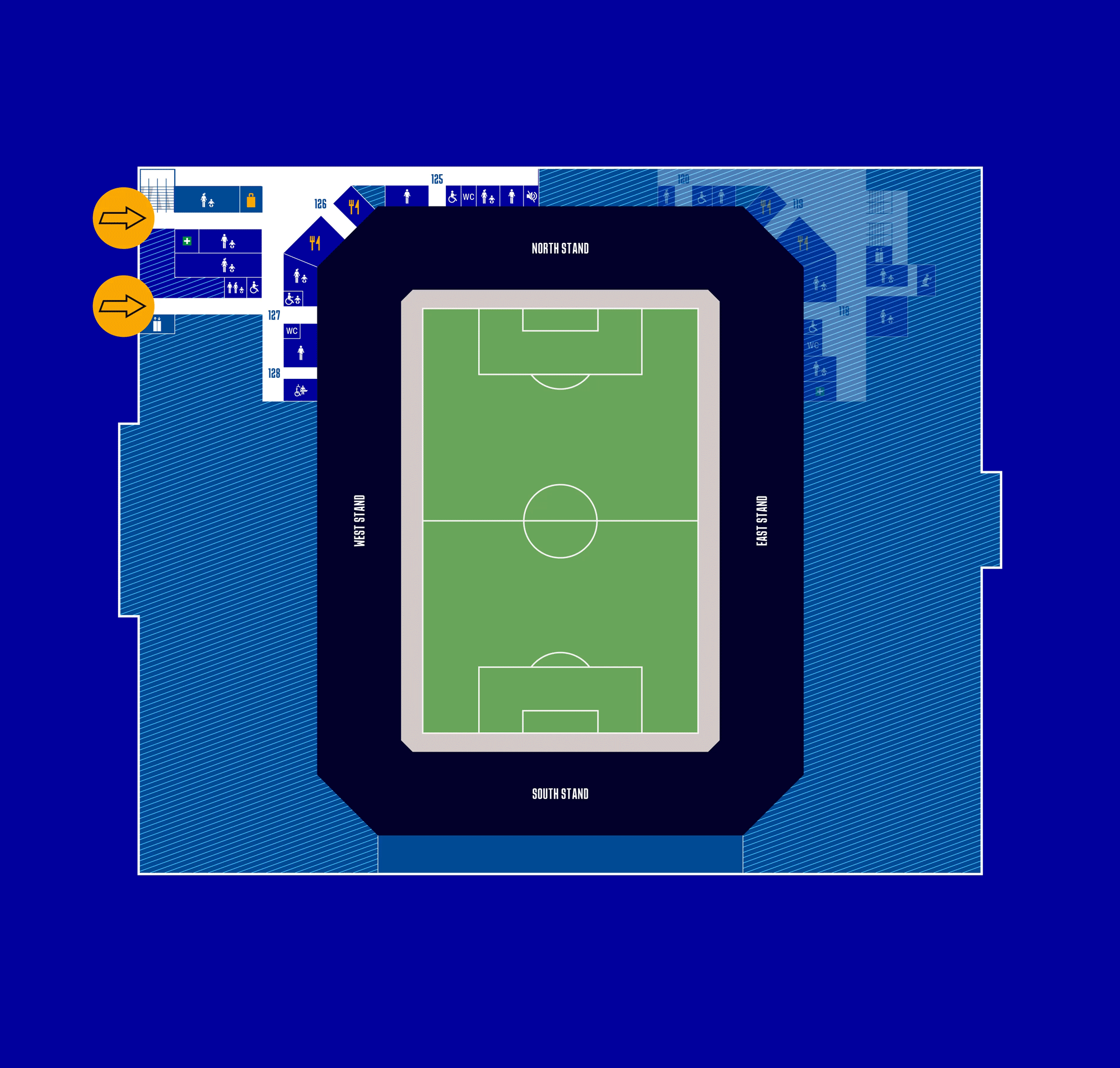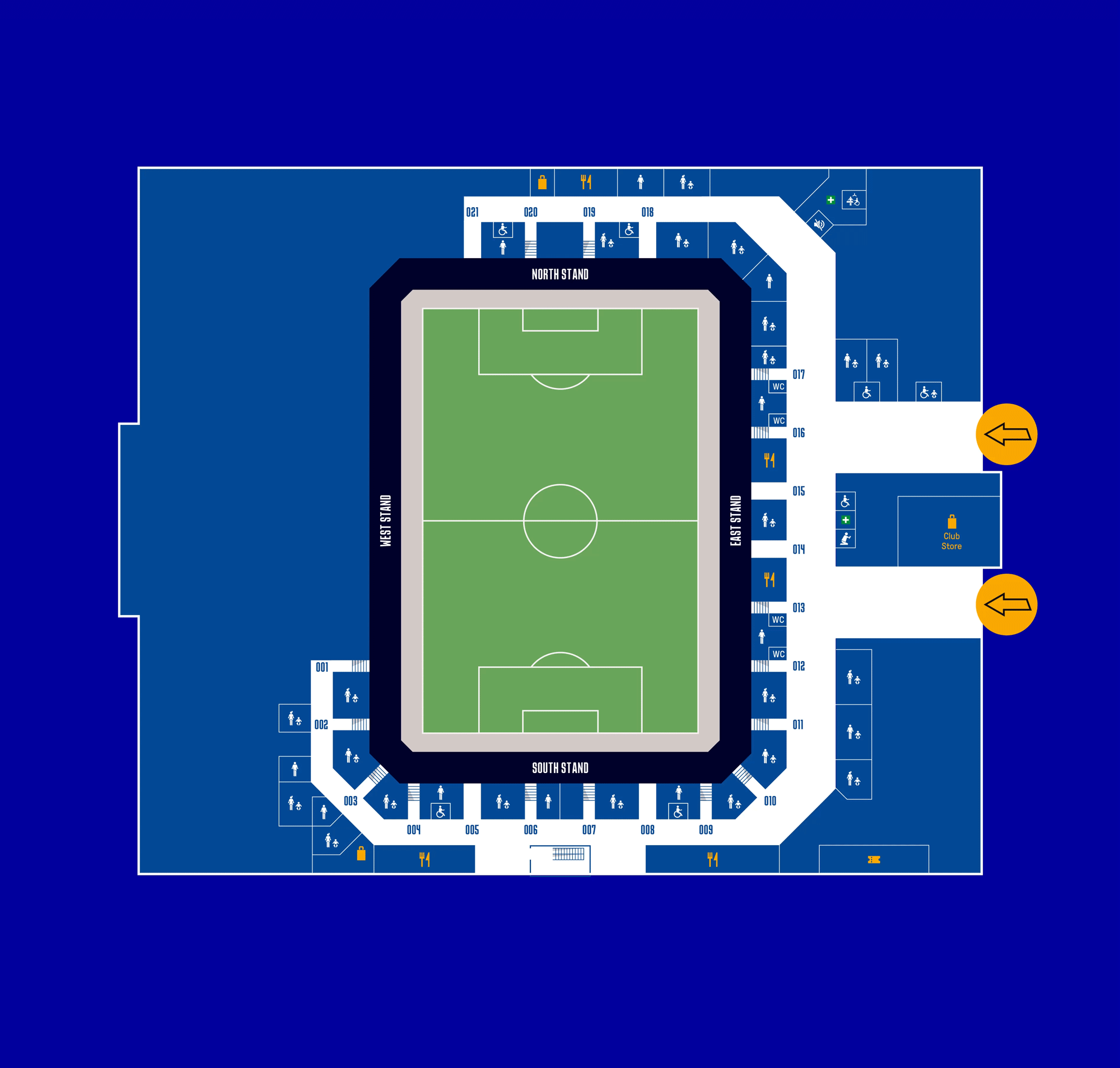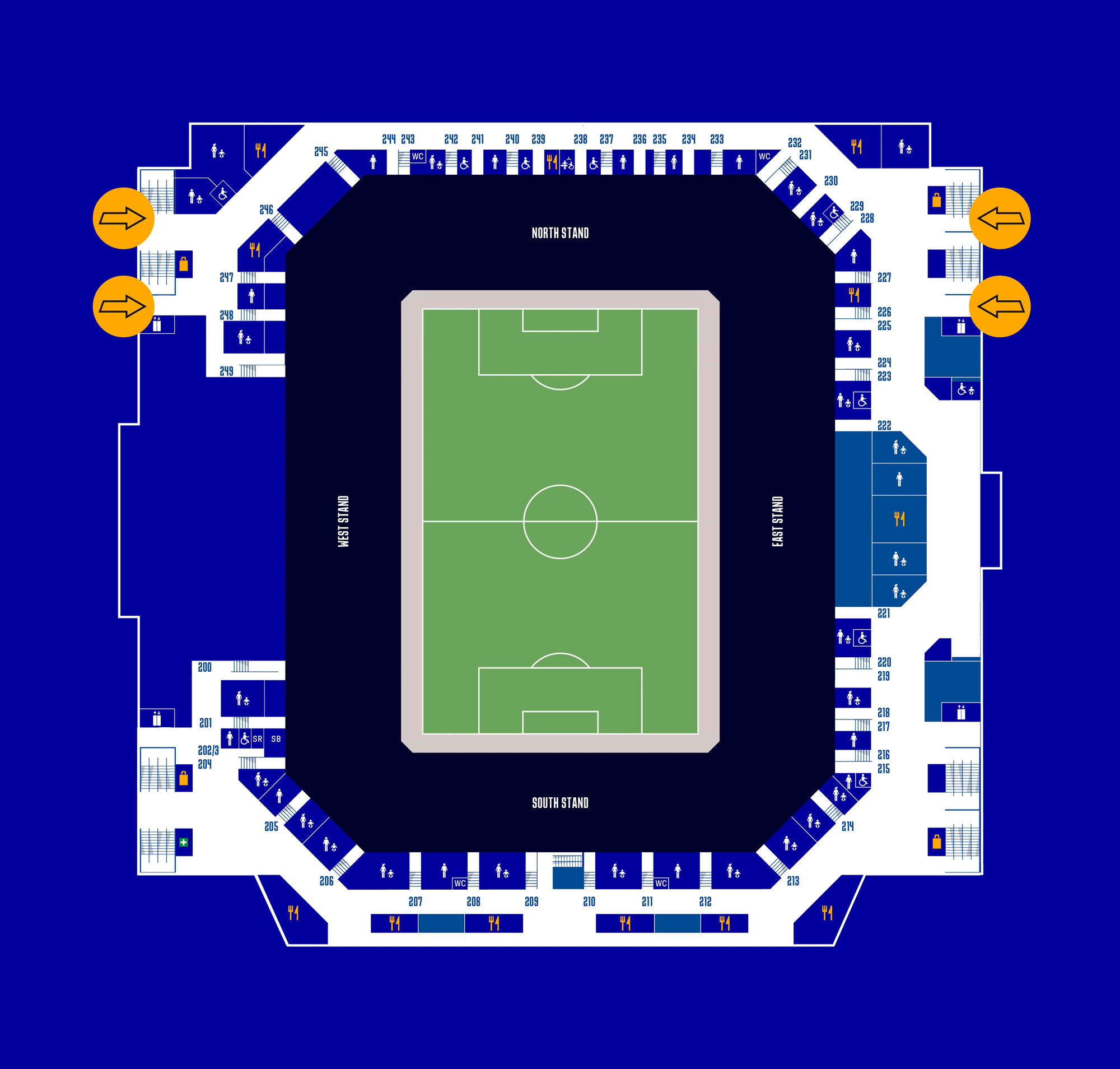 Two pitch-level wheelchair platforms are accessible from this concourse, while all supporters on Level 0 have access around the stadium on this level, into the East and South concourses and south-west corner, giving access to even more food and drink options and toilet facilities.
